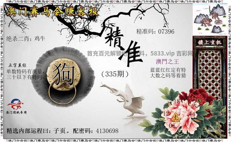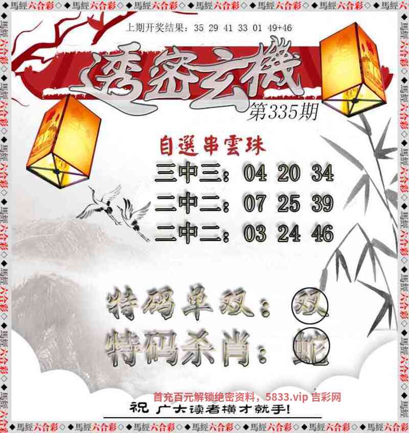 | 335期:今期猪兔猴出特,经行绿叶望成盖开:狗44准 ②合双+小数 |